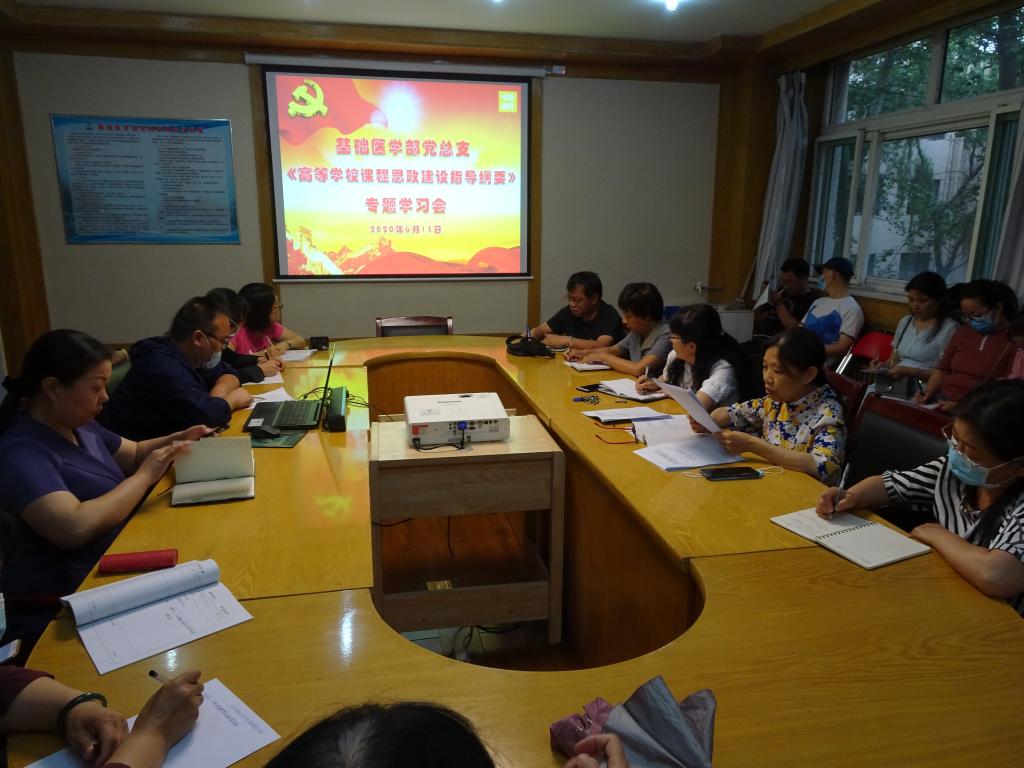 梁建君介绍了教育部印发《高等公司课程思政建设指导纲要》的背景意义、目标要求和重点内容,围绕培养什么人、怎样培养人、为谁培养人这一根本问题,全面提高人才培养能力这一核心点,科学设计课程思政教学体系,着力解决专业教育与思政教育“两张皮”问题等进行了重点介绍。各科室主任讨论分享了学习《纲要》文件的心得体会,交流了抗“疫”期间线上教学课程思政建设方面的经验。