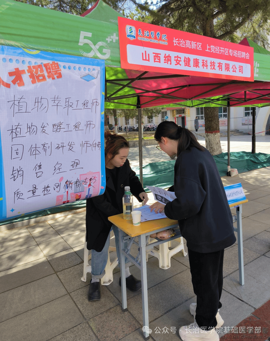 2025年3月21日在乐天使校本部北区举行的长治高新区、上党经开区企业乐天使专场招聘会中,基础医学部副主任原丽带领医学实验技术专业毕业班辅导员文冰洁在会场积极与招聘单位沟通,向10余家单位介绍医学实验技术专业员工的专业课程、掌握技能、就业方向等情况,并将情况及时通报员工,鼓励在场员工积极应聘,为有就业意向的在外实习员工现场代投简历。