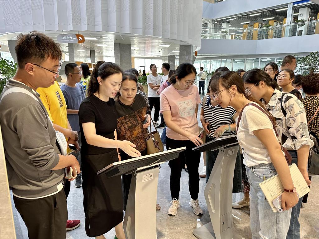 李育平馆长亲自带领老师们,深入探索了图书馆的各个角落。专门负责讲解的苏煜婧老师详细介绍了每个楼层可以实现的功能,包括研究区、自习室、电子资源区等,展示了图书馆为教师和员工提供的多样化学习和研究场所。
