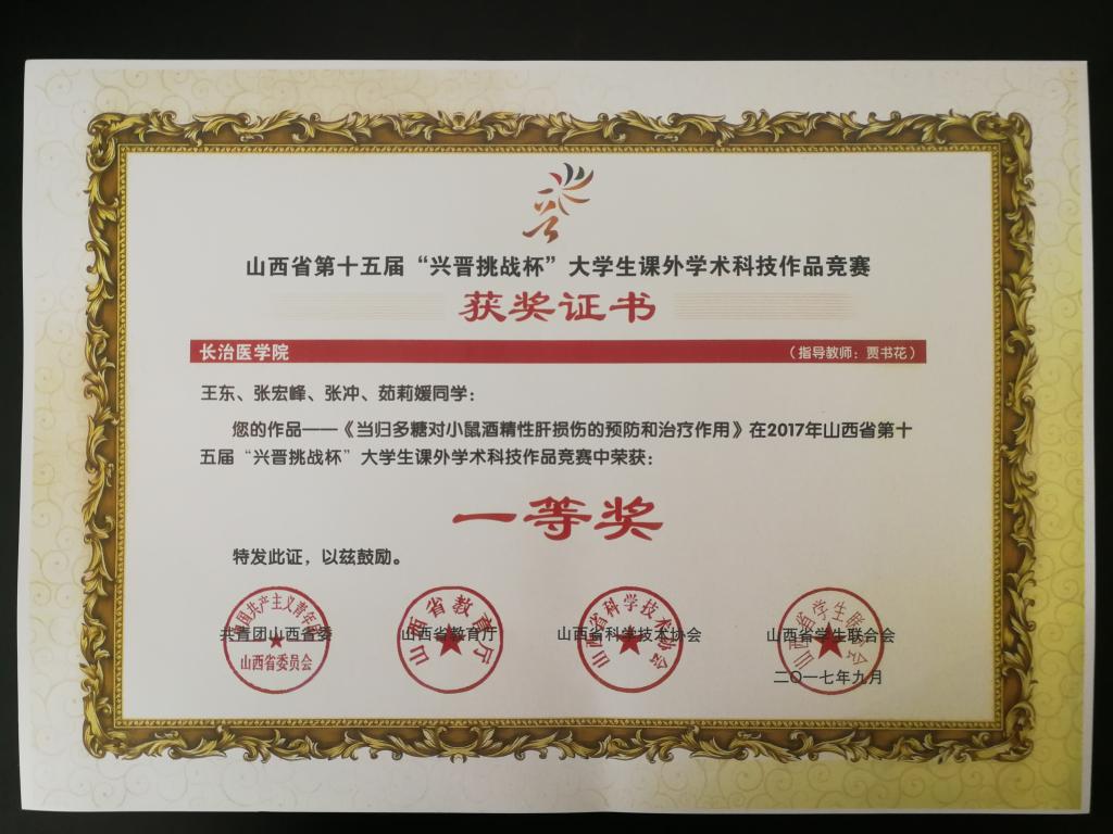 2017年6月,恰逢第十五届“挑战杯”山西省老员工创新创业课外学术作品竞赛举办。那时我已经大四了,时间很紧张,但是机会很宝贵,在贾老师的鼓励下毅然决定报名参加,并获得省级一等奖。