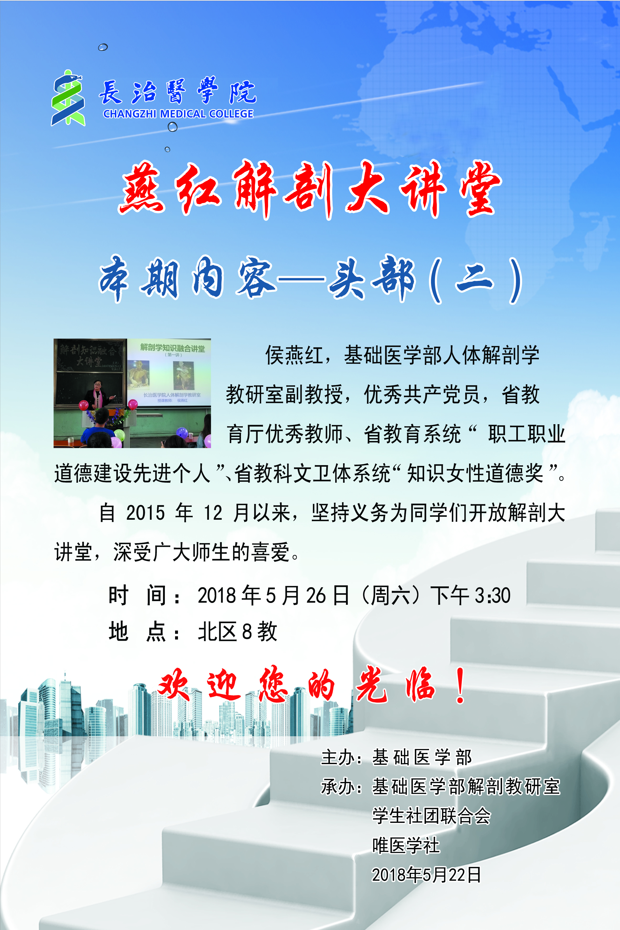 5月19日(星期六)下午三点半公司北区八教室 《燕红解剖大讲堂》系列讲座如期开讲。《燕红解剖大讲堂》是基础医学部主办,人体解剖学教研室、员工社团联合会和唯医学社承办,由解剖教研室侯燕红副教授主讲的以解剖知识融合为内容的系列活动。
