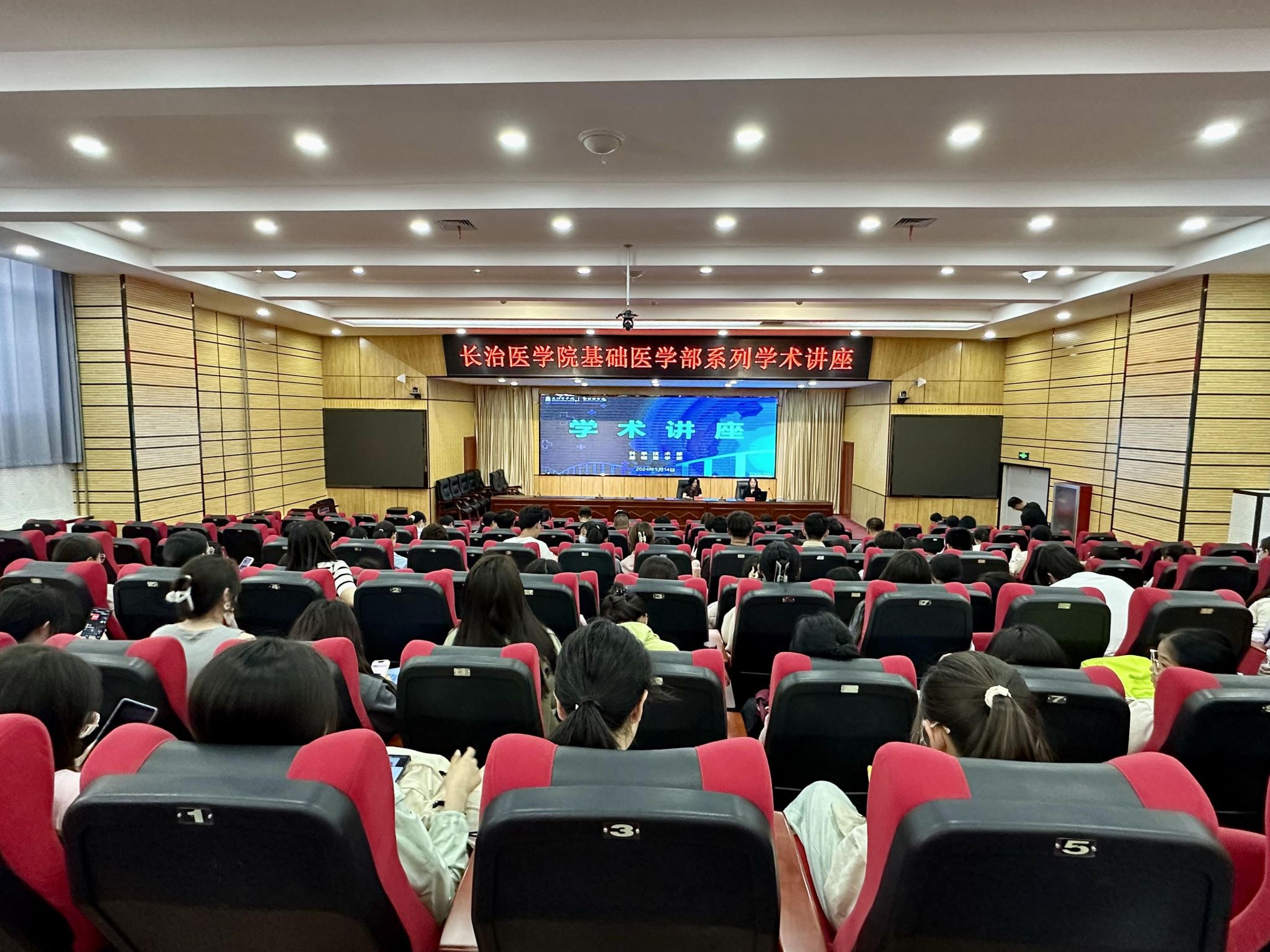 座谈结束后,周洁在济世厅以《孕期生物钟节律与新生儿炎症》为题作了学术报告。来丽娜出席并致辞,基础医学部党政领导和师生代表聆听报告。