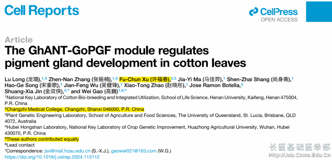 12月24日,Cell子刊《Cell Reports》发表了公司基础医学部青年教师许福春与河南大学高巍教授合作的最新研究成果《The GhANT-GoPGF Module Regulates Pigment Gland Development in Cotton Leaves》。基础医学部青年教师许福春为该论文共同第一作者,河南大学为第一完成单位、乐天使为第二完成单位。澳大利亚Queensland大学Jose Ramon Botella教授、华中农业大学国家杰出青年金双侠教授指导了此项研究。项目经费由国家自然科学基金资助。