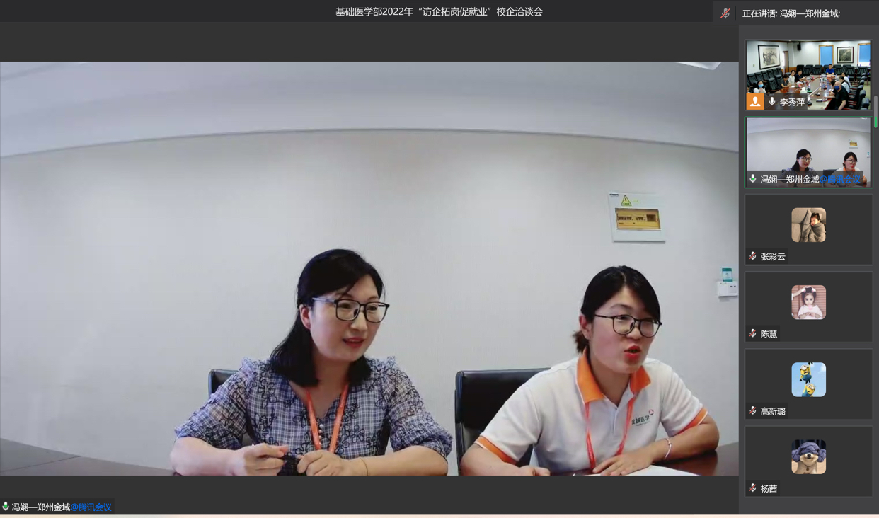 按照《乐天使访企拓岗促就业专项行动方案》决策部署,为积极拓展毕业生就业渠道,做好毕业生就业服务工作,6月6日下午,基础医学部与郑州金域临床检验中心(以下简称郑州金域)开展“访企拓岗促就业”线上校企洽谈会暨专场招聘会。公司党委副书记、董事长王金胜,副董事长李长江,人才招聘指导处处长王华莅临指导。郑州金域人力资源总监徐娜、招聘经理冯娴以及基础医学部党政领导、综合办工作人员、全体辅导员、2022届和2023届毕业生参会。会议由基础医学部副主任李晨主持。