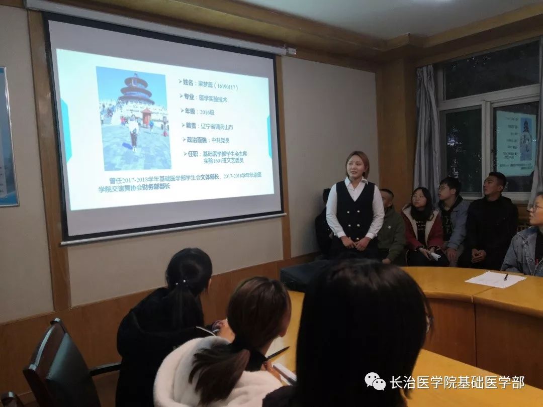 基础医学部党总支书记梁建君、基础医学部主任张翠英教授、基础医学部党总支副书记李萍、基础医学部副主任张雄鹰教授、生化教研室主任裴晋红、形态党支部书记李建斌、生理办公党支部书记李淑芬、分团委书记兼辅导员李明老师以及员工会、17级、18级员工代表担任本次评委,部分同学观摩大会。