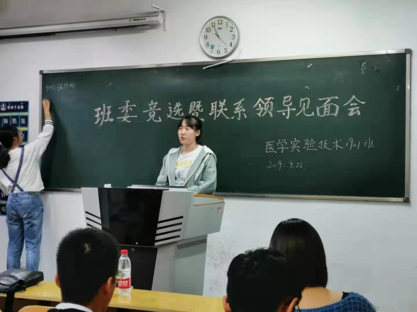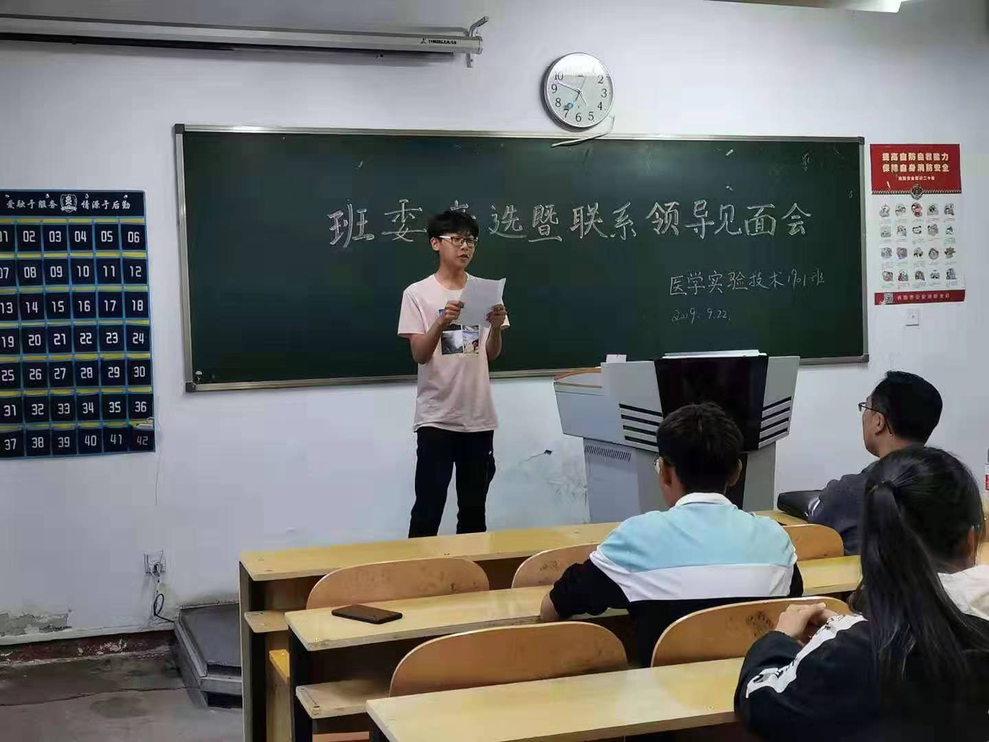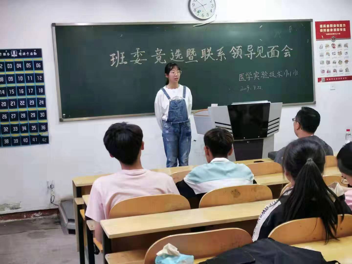 在紧张忙碌的军训过后,为团结全班同学共同进步,使班级相关活动有序、有效地开展,更好地加强班级凝聚力,实验1901班于2019年9月22日下午在北区24教开展了医学实验技术1901班联系领导见面暨班委竞选会。参与人员有基础医学部副主任张雄鹰教授,基础医学部分团委书记、16级辅导员李明老师,17、18、19级辅导员李秀萍老师以及19级全体同学。