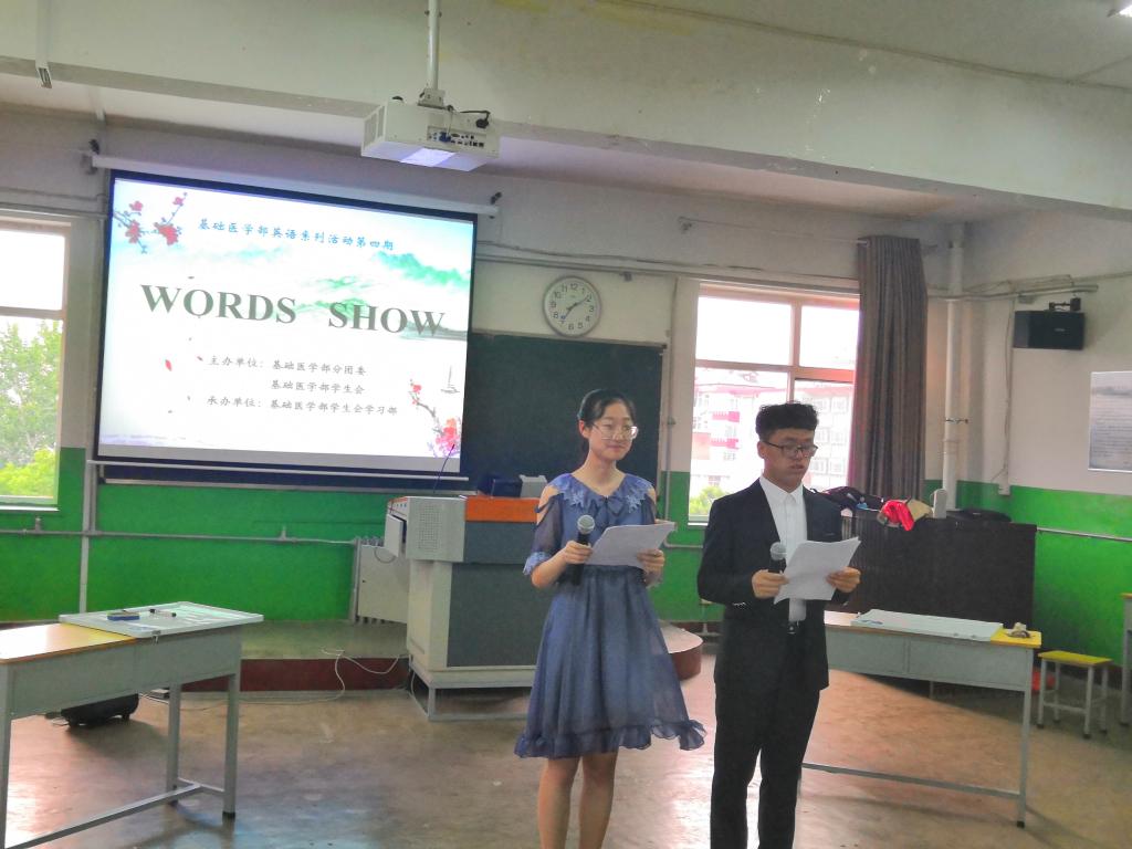 为了营造良好的英语学习氛围,进一步丰富校园文化生活,创造浓厚的英语学习氛围,让员工在英语活动中体会到学英语、用英语的快乐。基础医学部于2018年5月25日晚7:00在北区65教开展了第四期英语系列活动“WORDS SHOW”。