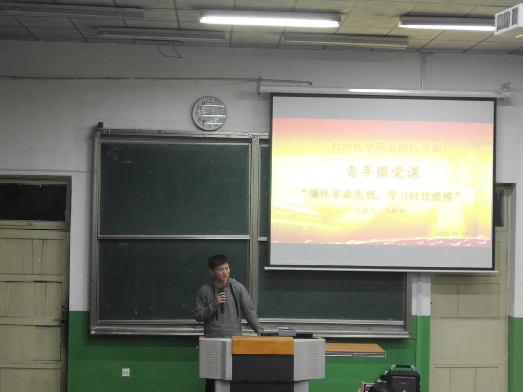 为弘扬民族精神,传承红色基因,坚定理想信念,基础医学部党总支于4月19日晚在开展了“微电影党课专题教育活动”第三期“缅怀革命先烈,学习时代楷模”主题活动。基础医学部分团委书记李明老师,全体在校预备党员、入党积极分子以及17、18级全体同学在北区五教室观看纪念英雄先烈的影片。本次活动由基础医学部党总支主办,员工会承办,主题活动由员工会主席梁梦蕊主持。